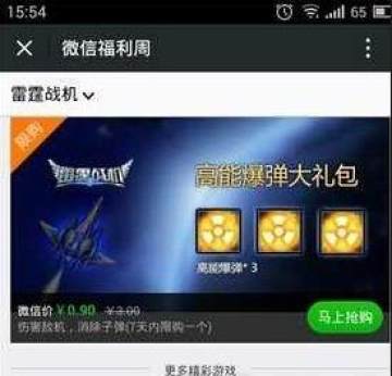 《雷霆战机》微信活动 0.9元高能爆弹大礼包购买流程 来源: 飞翔小编 2014/10/17 11:42:37 浏览量:341 雷霆战机微信活动周活动正在火热进行中!下面给大家介绍《雷霆战机》0.9元高能爆弹大礼包购买流程,一起来看看吧。雷霆战机微信礼包购买方法1、打开微信我的钱包-游戏微商店!2、在游戏微商店顶部的微信游戏福利!3、找到雷霆战机!【0.9元高能爆弹大礼包!】注意:1、注意,第一次开通快捷支付,就可以使用0.9元换购0.9元礼包!2、同一个用户只7天内限购一个!