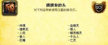 摸摸你的头:对游戏中的所有十二个种族使用沉重的南瓜灯。沉重的南瓜灯主要由无头骑士掉落,同时日常任务也会给予你一定数量的南瓜灯,在拥有足够数量之后,呆在达拉然找其他种族使用吧。不过这也许不适用于阵营对比悬殊的服务器,那么你可以选择战场来完成此成就。
