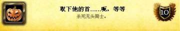 取下他的首……呃,等等:无头骑士是万圣节成就的一个重点,其出现位置为血色修道院墓地区,85级Boss级角色,需5人组队击杀,每人每天可召唤一次。在击杀后,同时会掉落365装等装备,大量奶糖(完成狼吞虎咽成就),同时还有可能掉落稀有坐骑无头骑士的缰绳。