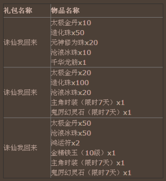 礼包共有三类统一为“诛仙我回来”,采集宝箱将有机会获得以下超值道具之一。
