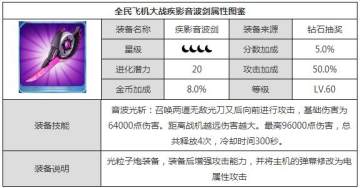 装备技能:音波光斩---召唤两道无敌光刀又后向前进行攻击,基础伤害为64000点伤害。距离战机越远伤害越大。最高96000点伤害,总共释放4次,冷却时间300秒。