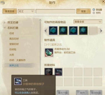 买好一定数量的材料之后就可以继续回到岩石加工台去制作冥界之石了,这个制作时要消耗的劳动力比较多,所以尽量找劳动力多的时候一起加工制作。当然等你的石工制作的熟练度上去之后,消耗的劳动力也会变少的呢!