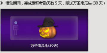 CSOL万圣节南瓜头怎么得 万圣节南瓜头活动奖励 来源: 飞翔小编 2014/10/23 10:11:53 浏览量:290 CSOL十月万圣节活动奖励万圣节南瓜头(30天)怎么得,获得方式非常简单:完成5天考勤就能获得万圣节南瓜头。活动期间还能免费使用万圣节南瓜雷。