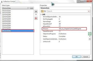 如下图所示,我在最后一个mission data里找到了我要修改的任务(任务名字带chapter的都是主线任务),然后点解绿框所示的下拉菜单