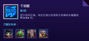 千里眼是没有距离限制的全图施法,是进攻型的视野技能,能为团战、追击、野怪宝物攻防战时定位敌方军团提供重要视野。