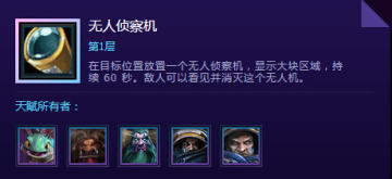 在固定放置一个无人机后,能提供视野、反隐,持续60秒。无人机可被敌方击落。