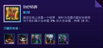 放置一个治疗结界后,范围内为盟友提供3%每秒,持续10秒的治疗,并且提供视野。