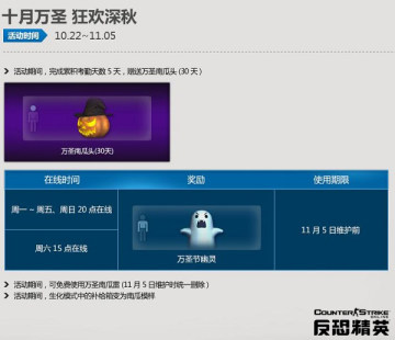 从10月22日到11月5日,玩家只要能累计达成5天登录,即可免费获得“万圣南瓜头(30天)”,同时活动期间内还可免费使用“万圣南瓜雷”,并且如果指定时间在线的话,还能获得“万圣节幽灵”。让你从头到尾华丽变身,成为万圣节装扮达人。