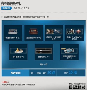 周一到周五日每天20点,还有周六15点以及周日20点这些指定时刻,玩家们只要保持在线状态,即可从普通强化材料(5个)、高级强化材料(1个)、暗影芭比+背刺银刃(3天)、恶魔之子+致命打击(3天)、战斗复活(3个)、更改昵称(1个)、活动专属破译芯片(3个)中任选一项作为奖励。
