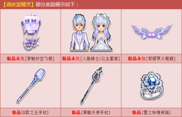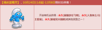 最唯美座椅再现世!10月24日上午11点起-12月8日,在商城购买“调皮蓝精灵”,开启就有机会获得永久[紫魅纱空飞椅]、永久[人鱼骑士/公主套装]、永久[紫樱冥火翅膀]或其他奖励之一。