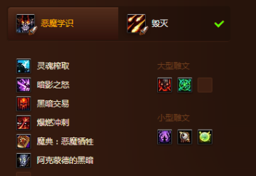 6.天赋:最大争议就是第五层天赋,不过对于毁灭来说,如果可以把握好时间脑残吼的额外DOT不会损失覆盖的话,可以选择牺牲,不过牺牲和统御的差距真心很小,不过牺牲略高。