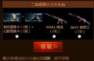 三级极限火力大礼包:累计获得过的火力值达到100,即可领取