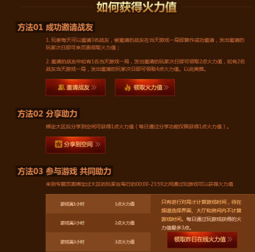 1. 玩家每天可以邀请3名战友,被邀请的战友在当天游戏一局即算作成功邀请,发出邀请的玩家次日即可来页面领取火力值;