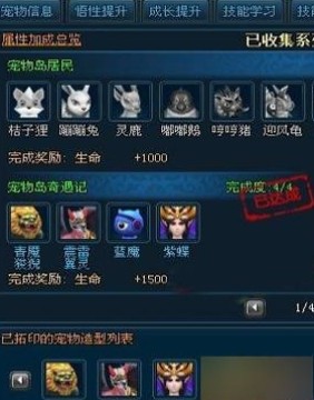 拓印需要收集宠物造型,一共有九套宠物列表。如果想要通过宠物拓印就需要将当前该套的宠物列表收集齐,并且参战之后就可以为角色增加属性了。比如某玩家将宠物岛奇遇记的宠物造型都收集整齐之后,并且参战,就可以获得宠物岛奇遇记动物化形为你增加的1500血了。
