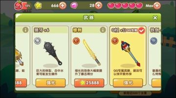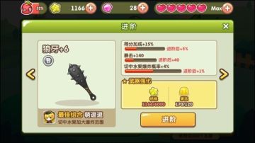 2、第一次升级武器需要消耗100个杨桃和一定数量的金币,以后每升级一次,消耗的杨桃和金币数都会增加,并且每次升级的效果都是增加0.5%的得分加成和0.5%的杨桃加成。