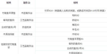 首先钓鱼竿的制作,下表就是“竹制鱼竿”的制作材料。