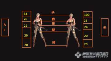 我们由上图可以看出,有AC的情况下攻击头部只有84的伤害,但除头部外,其他位置的伤害有无AC伤害差距不是太大,所以对敌时,使用扫射时非常不错的选择,尤其是200发的大弹夹,扫射起来一定是非常的爽快。