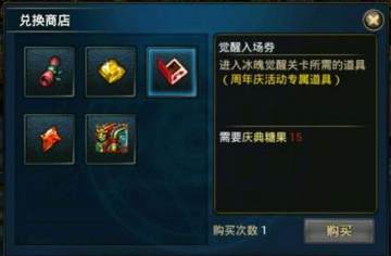 玩家需要利用15个庆典糖果在兑换商店兑换觉醒入场券。