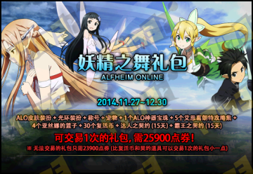 妖精之舞(ALO)套售卖时间:11月27号~12月30号,售卖期间开放活动地图世界树入口和世界树系统区域。