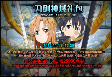 刀剑神域(SAO)套售卖时间:11月11号~12月30号,售卖期间开放活动地图艾恩葛朗特。