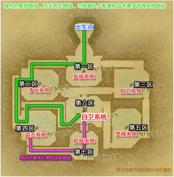 首先看下邂逅篇2层的地图,其中自卫系统是最终BOSS,各区都有一个球型小BOSS,也都各会一个特殊技能。在和自卫系统战斗时,自卫系统会使用其他仍然存活的系统的特殊技能。如果之前打死了某个系统,那么在和自卫系统战斗时便不会再用该系统的特殊技能,但相反BOSS会得到一项对应的加成(参照下面的列表)。推荐路线如图绿色所示路线,该路线也是后期用速推打法速刷时常走的路线。需要注意4点: