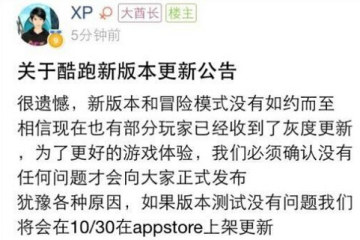 天天酷跑1014年10月30日官方公告 来源: 飞翔小编 2014/10/30 10:17:54 浏览量:371 在天天酷跑游戏中,新版本和冒险模式并没有如约而至,究竟为什么呢?下面给大家带来10月30日酷跑官方对于此次跳票的说明公告。
