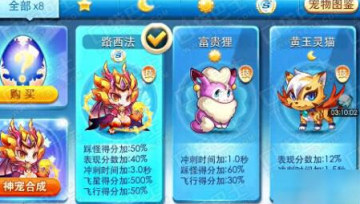 路西法可谓是新版本出现的最强大的宠物,集所有优点于一身,抛开40%的表现得分不说,冲刺时间加3秒,飞行得分加50%搭配超能少年绝对又是玩家们的最爱!还有踩怪得分和飞星得分助阵,基本和所有的人物坐骑都有搭配。无疑将会是翻新历史篇章的绝世神宠。不过相对来说,糖白虎和舞狮闹闹配合度没有其他的组合高。