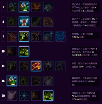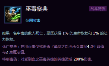 1)死亡祭典(特质)注意,特质其实属于天生被动技能,但有时候一些职业是主动激活或者通过天赋加强为主动技能:死于死亡祭典的单位,你会永久增加4点生命和2点法力,单位包括,小兵,野怪,英雄。最后20级时,你会拥有3K以上的血量。玩过WOW都知道,PVP的法师血量是多么的重要。提示:你的普攻和技能都有这个被动技能特效,而且不用非要补刀最后一下,只要那个单位身上带有毒,被任何方式打死,都算在内。因此合理的运用技能和普攻来叠加你的成长。备选:鲜血仪式(特质),这个被动我建议带线清野拆塔流使用,或者已放保护奶量很足,需要你频繁的参与团战输出清线,但是我很少用这个特质。