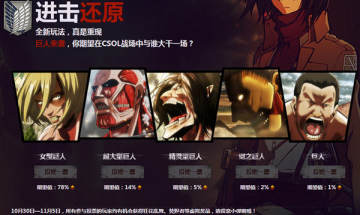 CSOL11月进击的巨人版本来袭 来源: 飞翔小编 2014/10/31 11:31:28 浏览量:1121 11月5日,CSOL重磅推出全新版本:进击的巨人。新玩法新角色在等着你。进击授权秒杀山寨,神作巨献!《反恐精英Online》是由NEXON创作开发的第一人称射击网游,拥有超高人气的“生化模式”系列,并且添加了大量可玩性强的武器,火爆战场真实体验,堪称玩家最喜爱的FPS网游巨作!最经典的FPS网游《反恐精英Online》与最热血的动漫《进击的巨人》开启战略合作,并在中国地区获得正版授权,将推出全新的进击的巨人版本,敬请期待!更多全新体验,尽在11月5日进击的巨人。