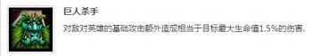 巨人杀手这个天赋很特殊,并不取决于英雄本身的攻击力,并且不受英雄本身任何天赋,技能的加成。当对敌方英雄进行攻击时,会先造成普通攻击伤害,再计算该英雄最大生命的1.5%,以额外的白字形式再造成伤害。