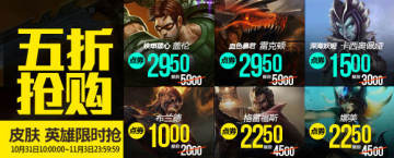 LOL英雄联盟10月31日英雄皮肤限时半价 半价英雄皮肤抢购地址 来源: 飞翔小编 2014/10/31 15:27:11 浏览量:373 英雄联盟10月31日-11月3日特别推出五折皮肤抢购活动。一起来看看这次的皮肤有哪些吧。本次五折英雄有小鱼人,龙女,男枪,火人等。皮肤更是种类繁多。五折英雄皮肤限时抢购地址>>>