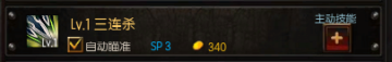 三连杀:建议点1,不建议舍弃,不建议点满。这个版本看上去是对这个技能有了一个加强,但是本人依旧不推荐点满。这个技能没有无敌,而且是攻击三下,并且会把怪物踢向正面。对于猎刃这种高爆发的职业来说,这个技能无疑只是衔接用而已。部分人选择舍弃这个技能去选择猫爪,原因是因为猫爪可以叠加流血。对这种做法,个人并不推荐。因为猫爪的释放时间过长并且没有无敌,而且总伤害也并没有三连杀要高,打角斗场的时候平推类型的技能很容易让怪物受身逃走。虽然流血层可以变相的等于是猎刃星的输出,但是依旧不推荐这个做法。PVP可以考虑点1点,但是也不要忘记这个技能虽然是平推不错的技能,但是也会给敌人增长很多怒气值。(技能变动:初始CD减少,满级CD减少、SP消耗减少,SP总消耗减少)