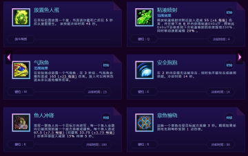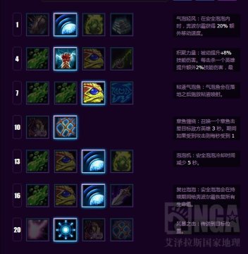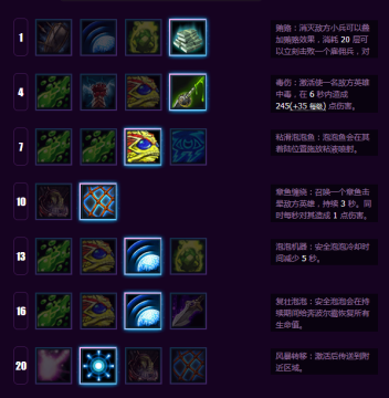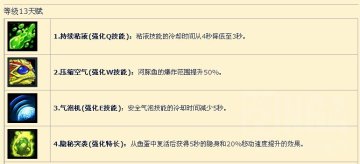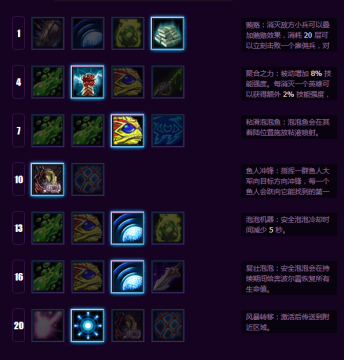 13级天赋。连续的粘液,减少1秒Q CD,很赞的技能,能大幅提升哇啦哇啦的伤害,但是我们是搅屎棍,搅屎棍就要用持续的恶心人的能力,所以13 16级天赋我会连点泡泡机和复壮泡泡,如果前期一直提升的Q天赋,这里也可以升粘液,但是你最一定要注意自己E的CD,不然挂了再次加入战场还是很漫长的;压缩空气,气泡鱼的范围提升50%,泡泡鱼的伤害很高,特别是加了16级天赋提升100%后,简直爆炸,但是我们是搅屎棍,专注搅屎事业1万年,如果你们这边有复数个团控,可以考虑13 16连点压缩空气和鳕鱼之怒,和提升Q一样,一定要注意自己的血量和E的CD;泡泡机是为了提升哇啦哇啦的搅屎能力必升的天赋,加上16级的复壮泡泡,9秒一次的满血状态超级恶心,可以吸收大量伤害,由于哇啦哇啦的脆皮,其实吸引仇恨的能力是相当高的,而Q的叠加效果,伤害也非常不错;隐匿突袭,话说这个天赋对于保护蛋是很好的,从蛋中复生10秒隐身,别人更加无法判断你的蛋的位置,保障了蛋的安全性,可惜我对于搅屎事业的爱已经无法阻挡了。