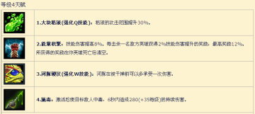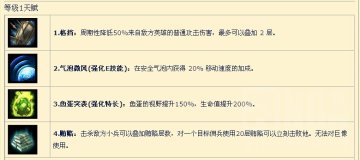 4级天赋。大块粘液喷射提升Q技能范围,由于哇啦哇啦的Q是主要输出技能还是很不错的,如果我们队伍偏向持续伤害,控制类很少的时候我会点这个;积聚力量,由于蛋的存在,哇啦哇啦基本不会死,会长时间保留20%的提升效果,特别是对于Q的第二次伤害提升很大,我们的事业需要他,而且Q技能黏人效果很强,基本可以贴住放,恐魔、矿坑、诅咒图我选择这个;铁甲鱼,泡泡鱼多承受一次伤害,个人觉得意义不大,铁了心打鱼的你多一次还是打得死的,而且泰凯斯这魂淡遍地都是;下毒,这个天赋是单杀天赋,极大的增强哇啦哇啦前期的作用,但是后期乏力,前期基本可以做到1换1,可以让哇啦哇啦在前期的圣地和金币抢夺战中发挥作用,在龙骑和黑心我会点这个天赋。