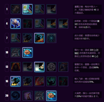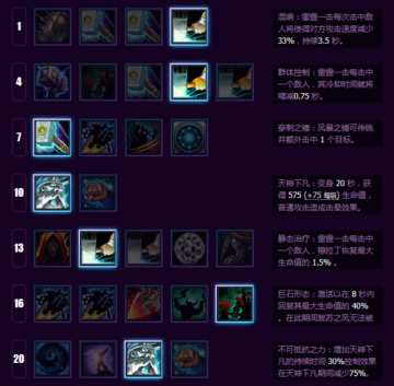 本天赋的核心就是雷霆打击的强化,可以大幅度提高山丘之王的单挑和GANK能力,配合战斗动能和走A技巧可以让山丘的技能连招如同行云流水一般。强力一击把敌方闲杂人等砸开,也可以把他砸给队友去收拾。