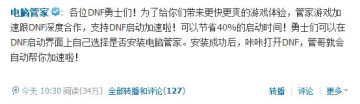 同时,就在今天早上,电脑管家的官方微博发布了一条关于“DNF启动加速”的微博,称在今天更新后,已经安装电脑管家的玩家就可以使用加速启动功能了。