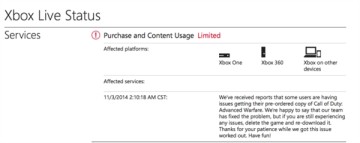 在首发日版上线后不少玩家都迫不及待地开始下载《使命召唤11:高级战争》,但不久后Reddit论坛就开始充斥着各种抱怨声,称安装进度到1%或是2%的时候就卡住不动了。一开始大家还以为只有参与了这款游戏测试的玩家才会遇到这个问题,但后来才发现其实受影响的用户远比想象要多,连Xbox 360版本都不能幸免。