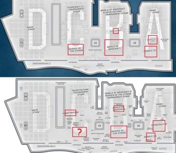 再来看看今天的场馆布局与去年的对比,暴雪嘉年华一直都是安奈海姆会议中心举办的,固定的场馆也就意味着展位相对的固定。但是在对比去年场馆布局图之后,我们发现C区的试玩区有了变化,去年被风暴英雄试玩区占据的位置在今年却是一片空白。又一片空白,是被占用还是有另外的试玩任务安排?
