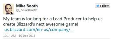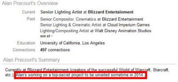 这话要从头说起,在今年的五月,暴雪的自身光影美工Alan Precourt被人发现在其领英个人简历上写下了这么一段“Alan正投身于一个将在2014年某个时候公开的最高机密项目”。这个东西刚被人们爆出,Alan的页面就整个被完全删除不可访问了,所幸万能的谷歌留下了快照。作为旁观者,我选择相信这个努力让自己的简历更丰满好看一些却遭PR粗暴干涉的可怜家伙。那么问题来了,在暴雪计划没有太大变动的情况下(虽然这种情况我们很难看到),2014年还剩下几天是适合公布一个最高机密项目的?