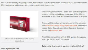 任天堂推出水晶红和水晶蓝2DS掌机 11月21日发售上市 来源: 飞翔小编 2014/11/12 21:12:47 浏览量:459 根据国外游戏媒体gamespot的情报,任天堂为了应对2014年末假日购物季,决定推出两款新色2DS掌机,其分别为水晶红和水晶蓝。这两款新色2DS掌机将采用蓝色或红色的半透明外壳,预计2014年11月21日发售,与《口袋妖怪 红蓝宝石重制版》配套同期上市,售价仅100美元,比之前的2DS售价130美元相比优惠不少。