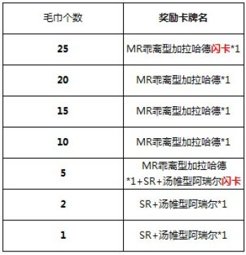 每次11连扭蛋都将获得1个“毛巾”(以道具形式发放至游戏内礼盒),集齐不同个数可获得特定奖励,最高奖励7星MR乖离型加拉哈德闪卡(每项奖励只可获得1次,不循环)!