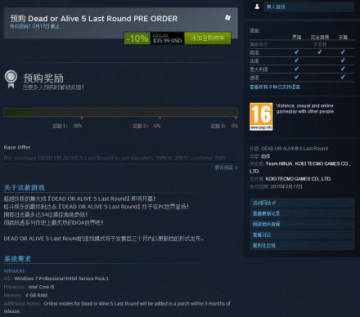 《死或生5最后一战》PC版2015年2月17日发售 来源: 飞翔小编feichenpan 2014/12/5 21:56:41 浏览量:365 根据Steam数字下载平台情报,《死或生5最后一战(DEAD OR ALIVE 5 Last Round)》将于2015年2月17日登陆PC,现今预购将有九折优惠,仅售35.99美元。该作联机对战模式将于游戏发售后三个月内以更新档的形式发布。从官方曝光的PC推荐配置来看,《死或生5最后一战》支持Win7系统,CPU为i5,需要4GB内存。