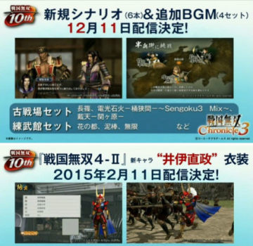 《战国无双编年史3》现已正式登陆PSV和3DS双平台,光荣官方现今曝光了该作最新DLC追加内容,将于2014年12月11日配信6个新剧本关卡和4首BGM,其中就有“半兵卫的挑战”新剧本和电光石火桶狭间BGM,而在《战国无双4-2》发售日2015年2月11日当天将配信“井伊直政”的服装,供自创武将搭配,可谓相得益彰。