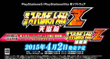 《第三次超级机器人大战Z天狱篇》预计2015年4月2日发售,登陆PS3和PSV平台,官网目前曝光了该作宣传片,展示了游戏中的参战作品以及各机体必杀技。本作初回特典为《第三次超级机器人大战Z连狱篇》下载码,共计15话内容,日后将不会单独贩卖,而继承前作通关存档则可获得额外特典。