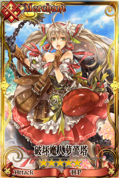 隶属副都的商人。凭借可爱的样子与举止,使她善于处理商业性的交涉。至于为何她手持极其狂暴的战斧,至今没有人敢问她。此外,背后战战兢兢地称她为「破坏魔人」的人也为数不少,但没人愿意透露为何如此称呼的详情。