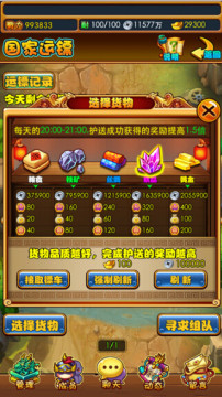 2、点击选择货物,可以看到5种商品,分为银币刷新和元宝刷新。银币是有几率刷到更好的商品,失败则会回到初始货物,而元宝则是100%成功。