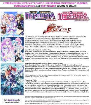 根据国外游戏媒体的最新情报,索尼PSV掌机游戏《超次次元游戏 海王星重生1》和《超次次元游戏 海王星重生2》以及PS3游戏《妖精剑士F》都将登陆Steam数字下载平台,各位可以在PC平台体验到超卖萌的日式RPG作品,之前没有玩过《超次次元游戏 海王星重生1+2》和《妖精剑士F》的PC玩家不要错过了。
