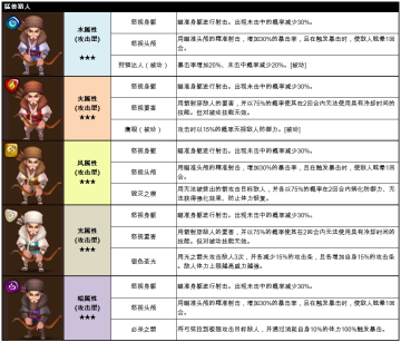 新年新气象,值此辞旧迎新之际,魔灵召唤游戏又推出了一大批全新的魔灵,而且全部是喜人的人型魔灵,分别是猛兽猎人、天空舞女、术士、仙人,其中猛兽猎人是三星魔灵,这里给大家详细介绍下各个属性下猛兽猎人的技能效果。
