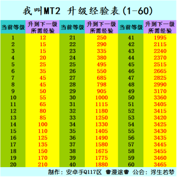 本人1.6号才开始玩MT2。由于40送公主的活动到16号凌晨3:59结束,一直纠结于15号能否升到40,在网上搜了很久都没找到升级经验表,开始萌生自己制作的念头,今天中午无意中看到有吧友在求好友的帖子里附了头像图,瞬间激发了我。总算基本收集完毕。低等级的经验自己也在135区新建了一个号,一级一级升补齐了。其中也发现了一个问题,就是有极小部分等级的升级经验有过很小的改动。例如11级升12级,刚建的新号显示需要65经验,但是12月17号的一张老图显示需要70经验,要是哪位兄弟发现经验表里有改动的,请务必提醒我...好了,说了那么多废话,下面给图啦!