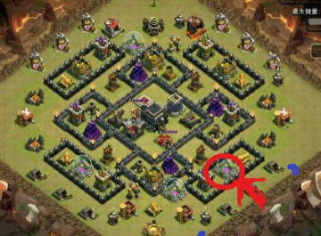 然后图中红色箭头为我预想的下狗的位置以及狗的前进路线,这个也不是固定的,各有各的想法,待狗靠近防空时气球也差不多开始投弹了,对于狂暴下的位置要覆盖到包含防空的最多的防御建筑,这个相信大家都懂,不多说,然后一步一步来,千万不要因为狗爆了而手忙脚乱,这是禁忌,要相信自己的操作和你的气球,差不多就是这样围着打一个圈就所有防御清完了,然后就是静静等待三星的时刻了吧。